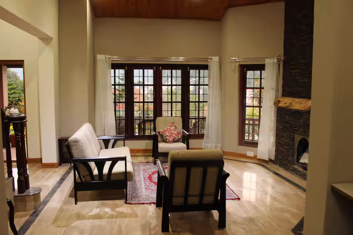 The lawn in front of the house is a great place for adults to unwind as the kids can run around inside the compound. The property offers a blend of heritage charm and modern comfort — spacious interiors open up to lush gardens and sweeping mountain views.